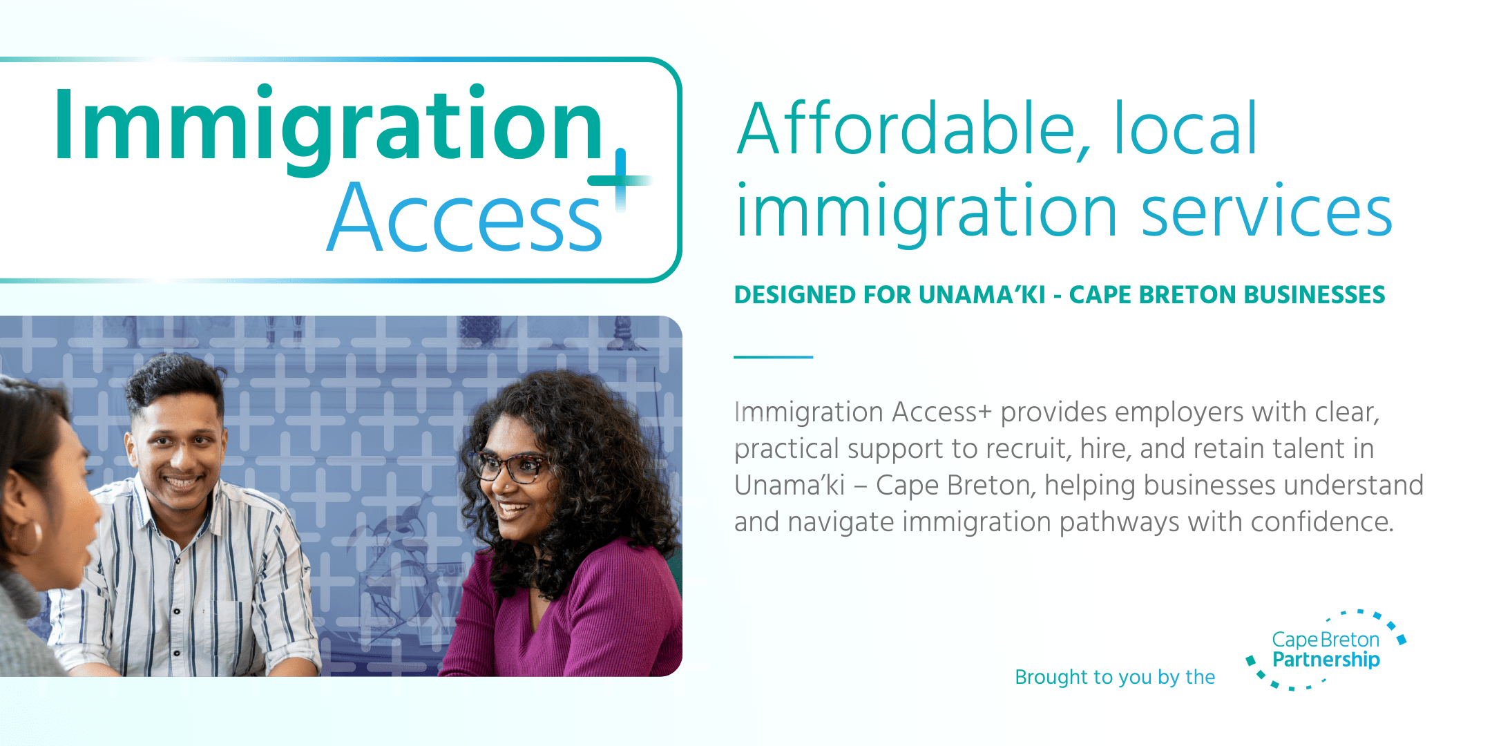 Immigration Access+ was developed to offer a locally-grounded option that reflects the needs and realities of Unama’ki – Cape Breton employers and newcomers, helping address gaps in locally available immigration services. The Cape Breton Partnership also collaborates with immigration lawyers as needed to ensure businesses and newcomers can access the right level of support at every stage of the process.