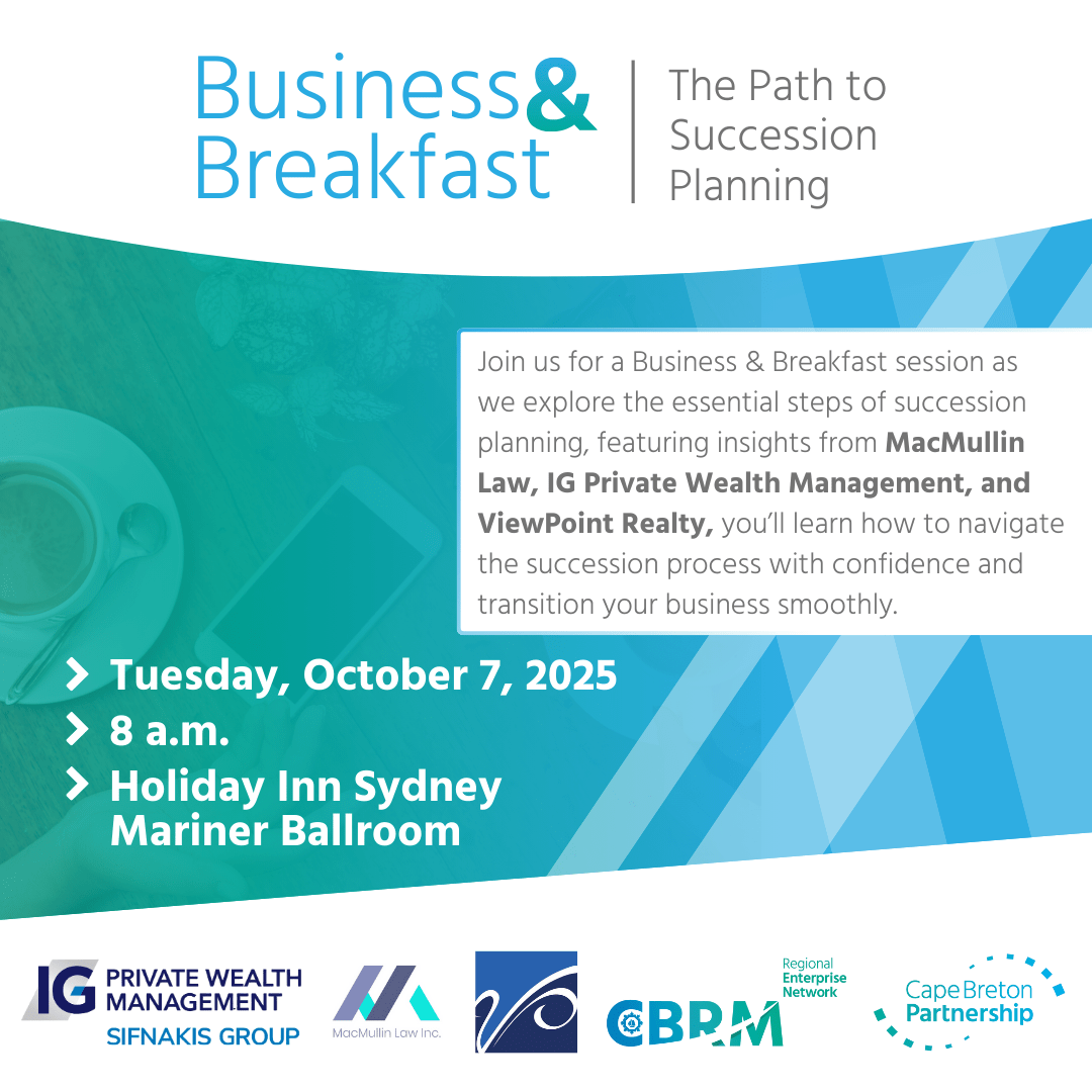 Join the Cape Breton Partnership and the Cape Breton Regional Municipality Regional Enterprise Network (CBRM REN) for the next Business & Breakfast Session: The Path to Succession Planning, happening at 8:00 a.m. on Tuesday, October 7, 2025, at the Holiday Inn – Sydney Waterfront’s Mariner Ballroom. This is your chance…